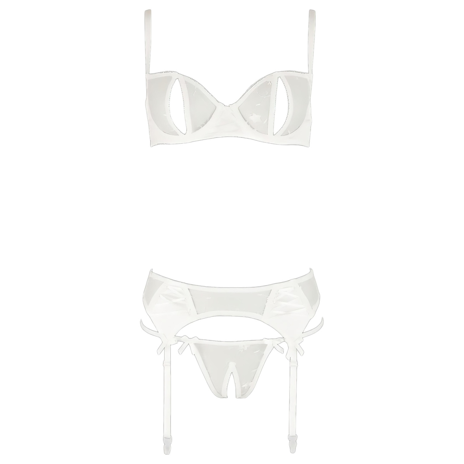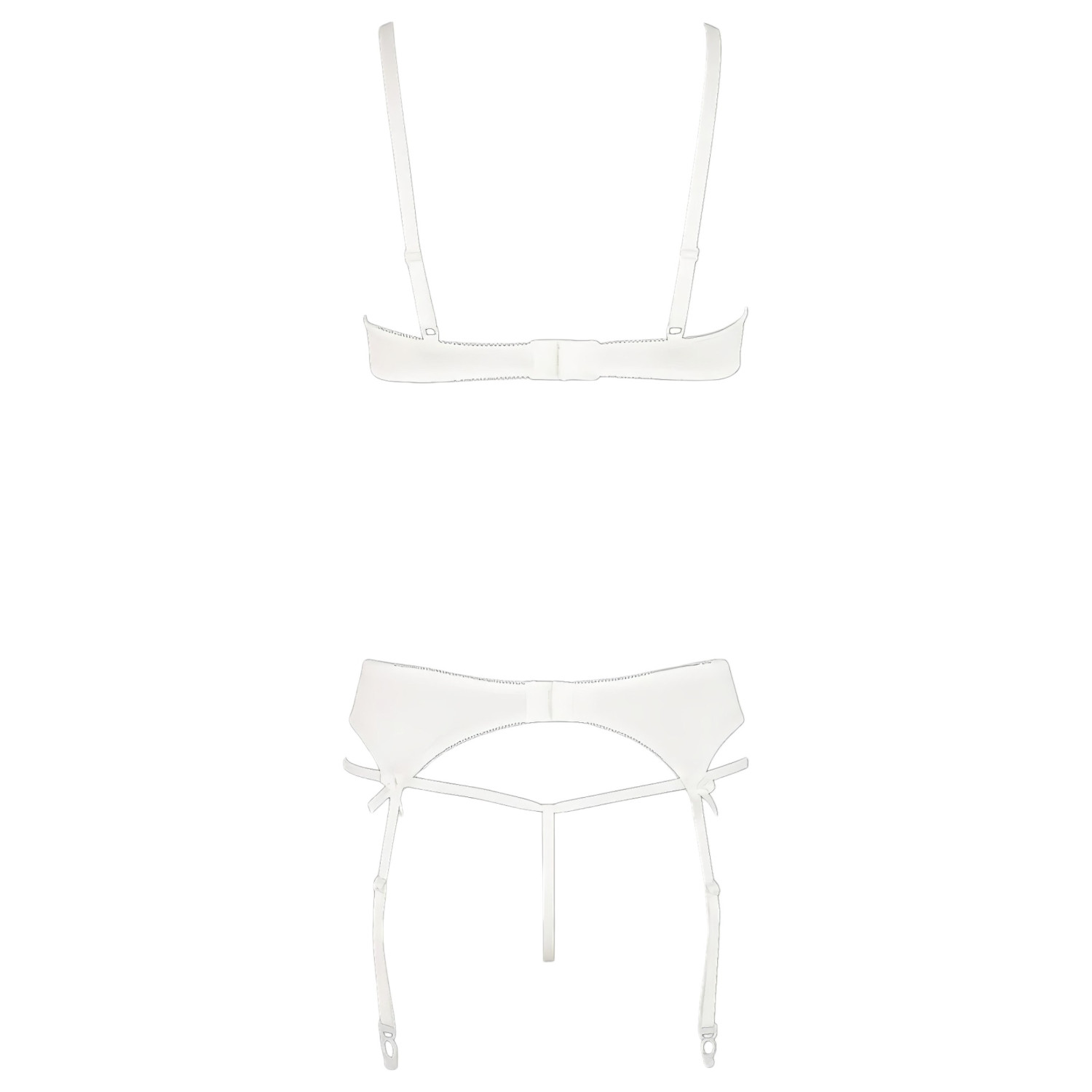 A hímzett csipkéből és rugalmas szaténból készült szett azonnal magára vonja a figyelmet. A merevített melltartó kényelmes tartást ad, a harisnyatartó állítható pántjai pedig tökéletes illeszkedést biztosítanak. A szexi nyitott tanga és a kacér masnik garantálják, hogy minden pillanatban izgalmasan nőies és csábító megjelenést nyújts. Ideális választás különleges alkalmakra vagy titkos, forró estékhez.