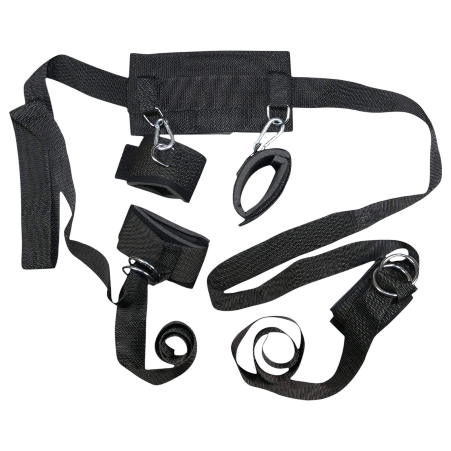 • 2 darab párnázott bokabilincs tépőzáras állítással, fém karabinerekkel.