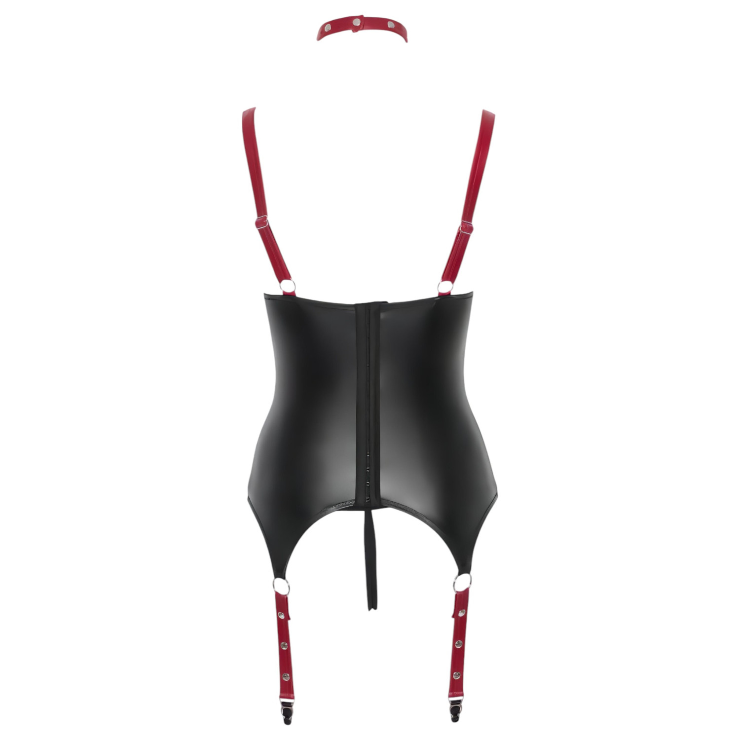 Vadító vörös pántok, fényes fekete anyag és szegecses kiegészítők – egy fehérnemű szett, ami a csábítás és dominancia tökéletes egyensúlyát teremti meg.