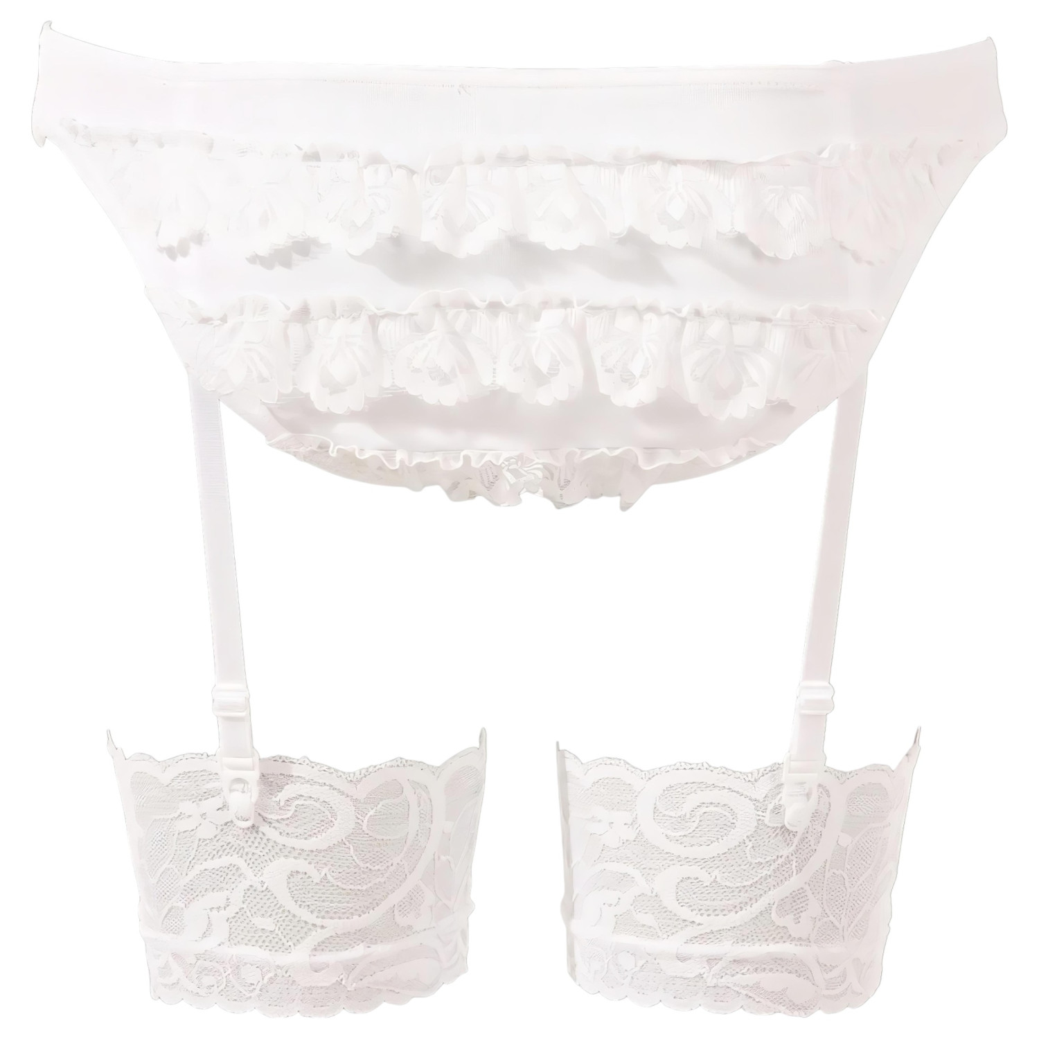 • Harisnyatartós, fodros alsó: Rugalmas anyagból, a popsinál csipkefodrokkal díszítve, 4 állítható harisnyatartó pánttal a tökéletes illeszkedésért.
