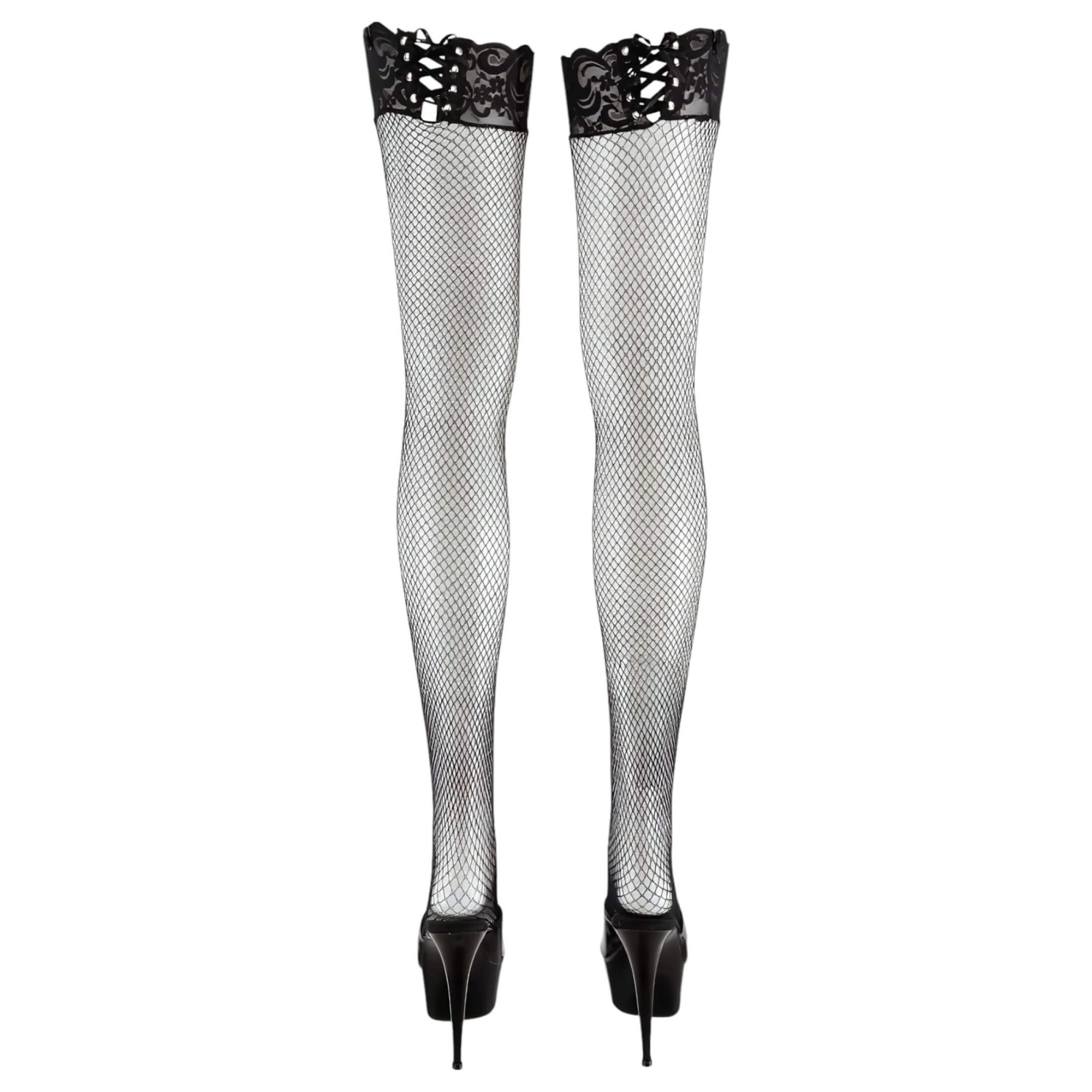 Áttetsző, combig érő harisnya széles, fűzős  csipke szegéllyel.