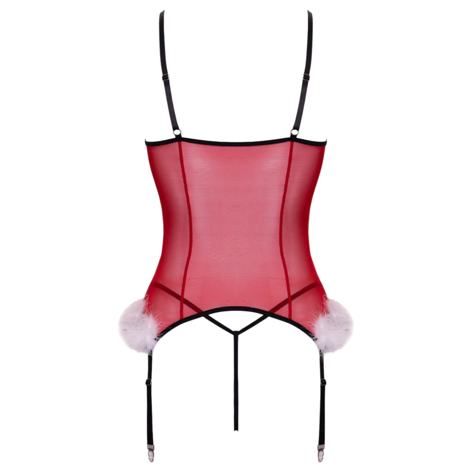 Ez a szett tökéletes választás, ha ünnepi hangulatot és ellenállhatatlan megjelenést szeretnél. A piros powernet és a finom csipke kombinációja elegáns és izgalmas, míg a fekete díszítés és a fehér tollak játékos kontrasztot adnak. Kényelmesen rugalmas anyaga és állítható pántjai miatt nemcsak szexi, hanem kényelmes viselet is.