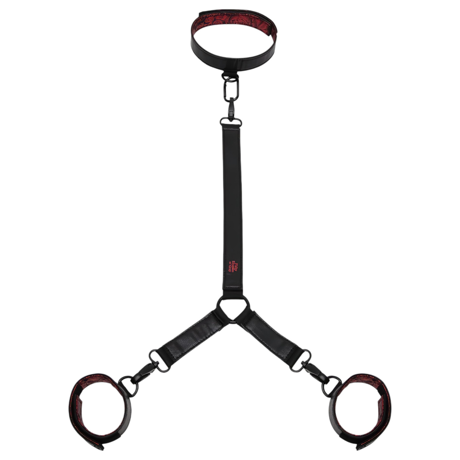 Szexi, vörös szatén borítású bilincsek, amit a hozzá köthető nyakörvhöz csatolhatsz.