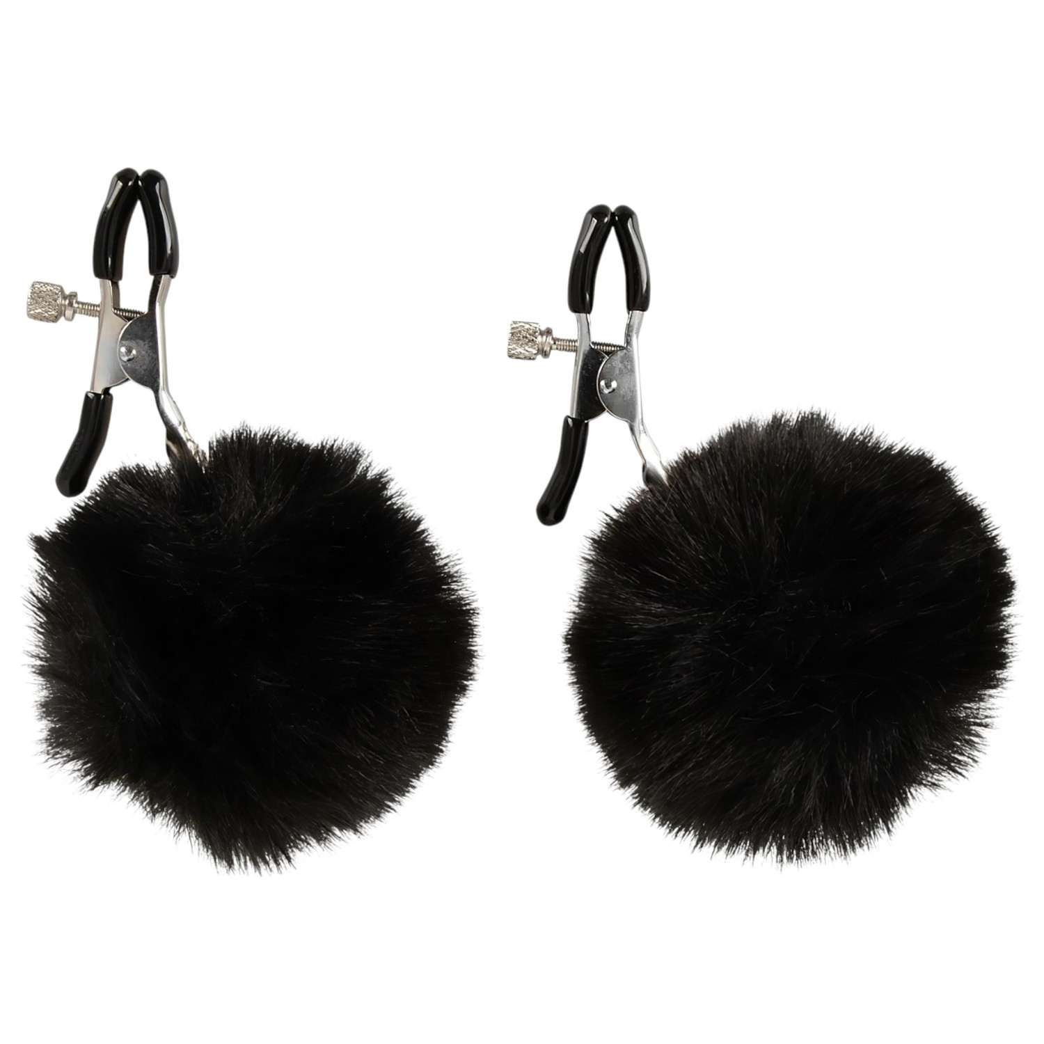 • 1 pár Magic Shiver fém mellbimbócsipesz fekete pomponokkal.