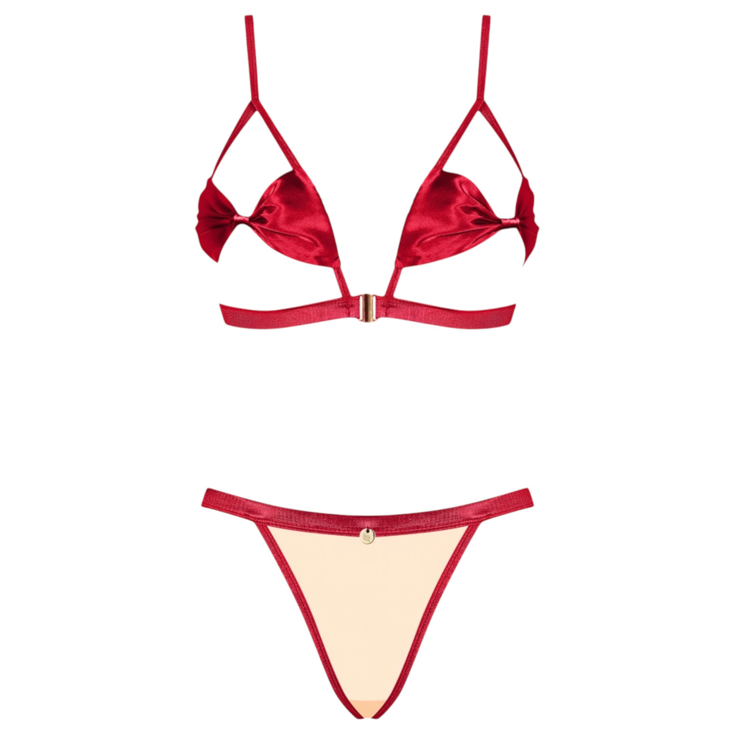 Az Obsessive Rubinesa szett egy érzéki és elegáns fehérnemű összeállítás, amely piros szaténból készült aranyszínű csillogással, nyitott-masnis kialakítással.
