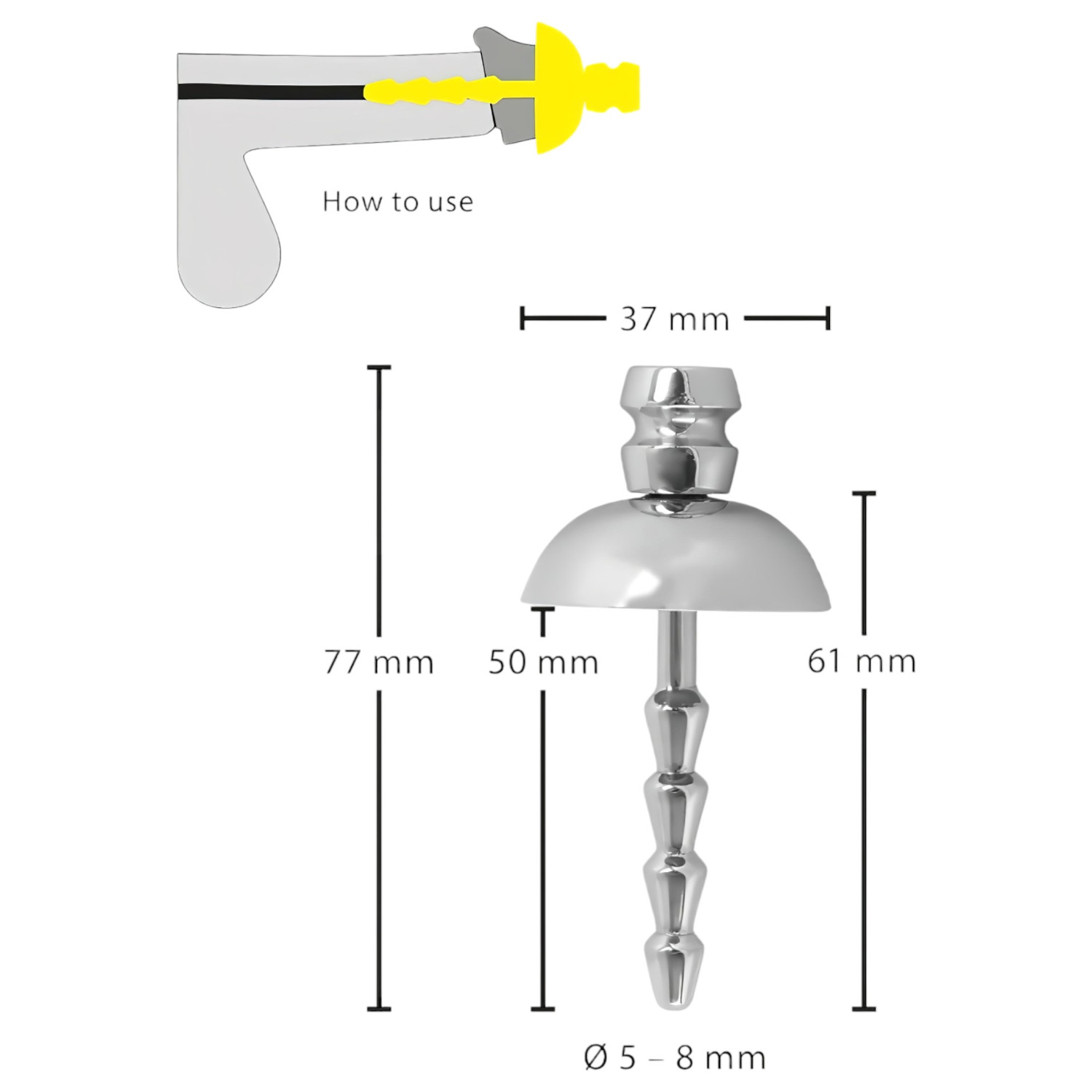 Nem mindennapi kéjérzet haladóknak! Kiváló minőségű, erős acélból készült, gömbös felszíni kialakítású, tömör húgycsőtágító, mely kis "esernyővel" és kihúzó gombbal készül.