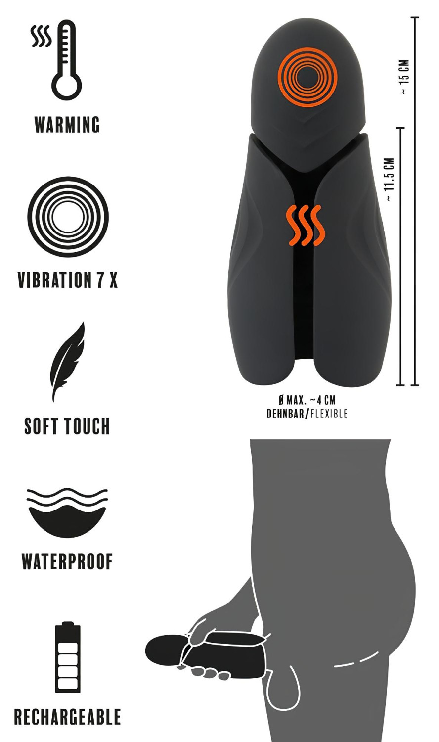 Síkosítsd be péniszed és a puha kényeztető belső felületét is, majd helyezd a maszturbátort a péniszedre. Kapcsold be a vibrációs módokat a gomb segítségével, és válaszd ki a megfelelő módot. Élvezd a semmihez sem fogható kényeztetést, amelyet a melegítő funkció és a vibrációs módok kombinációja nyújt.