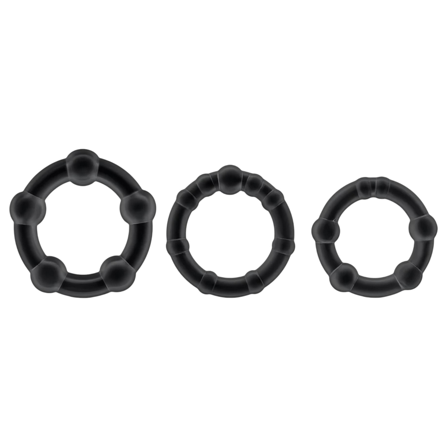 A Stay Hard Beaded Cock Rings szett három különböző méretű gyöngyös péniszgyűrűt tartalmaz, amelyek egyenként vagy együtt is használhatók az erekció fokozására és a korai magömlés megelőzésére.