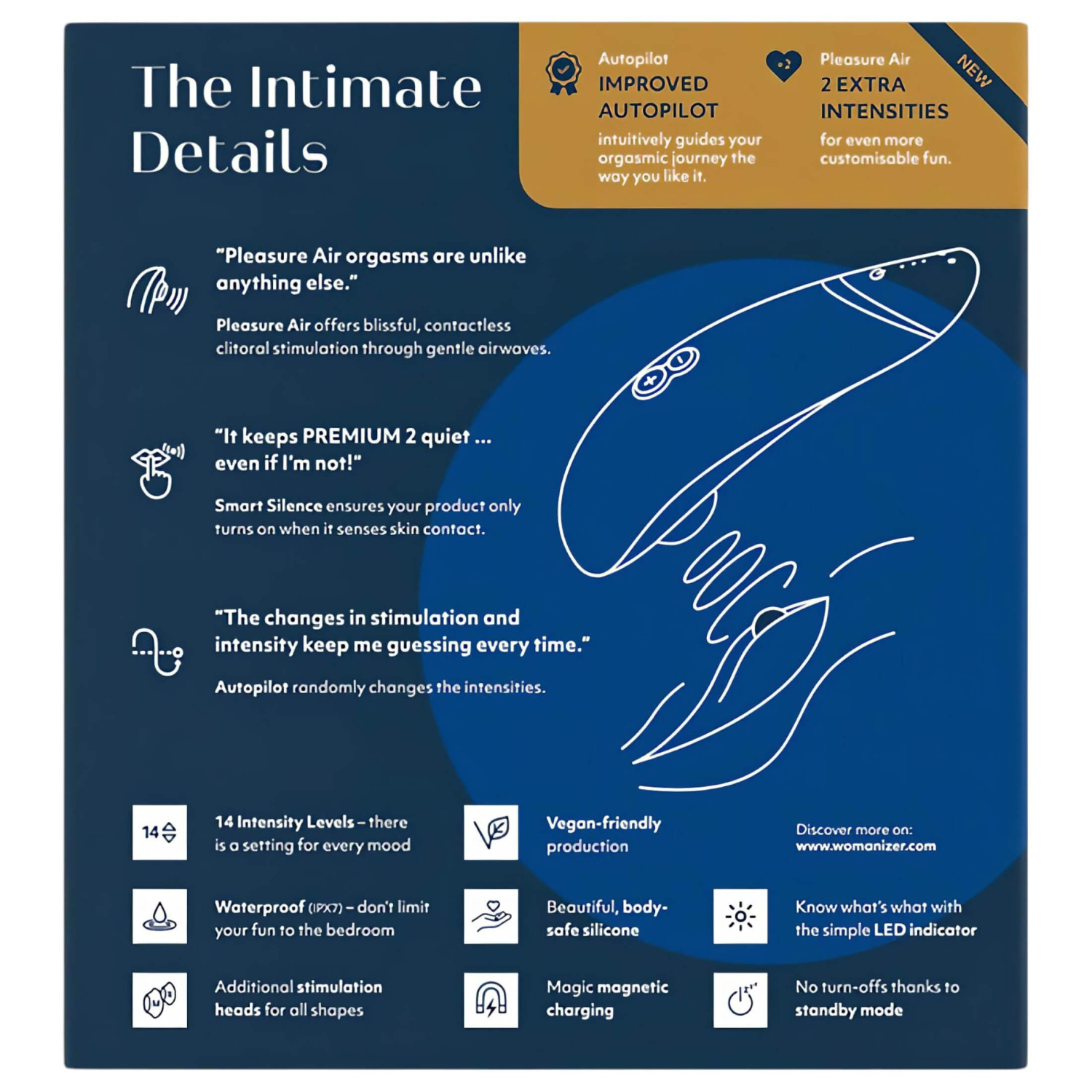 A Womanizer Premium 2 a legfejlettebb technológiával készült luxus csiklóizgató, amely forradalmasítja az intim élményt. Az érintésmentes léghullámos stimuláció 14 intenzitási szinten érhető el, miközben az intelligens Smart Silence funkció gondoskodik a diszkrét működésről. Az Autopilot Mode meglepetésszerűen váltogatja az intenzitást, így minden használat egyedi és felejthetetlen kaland lesz.