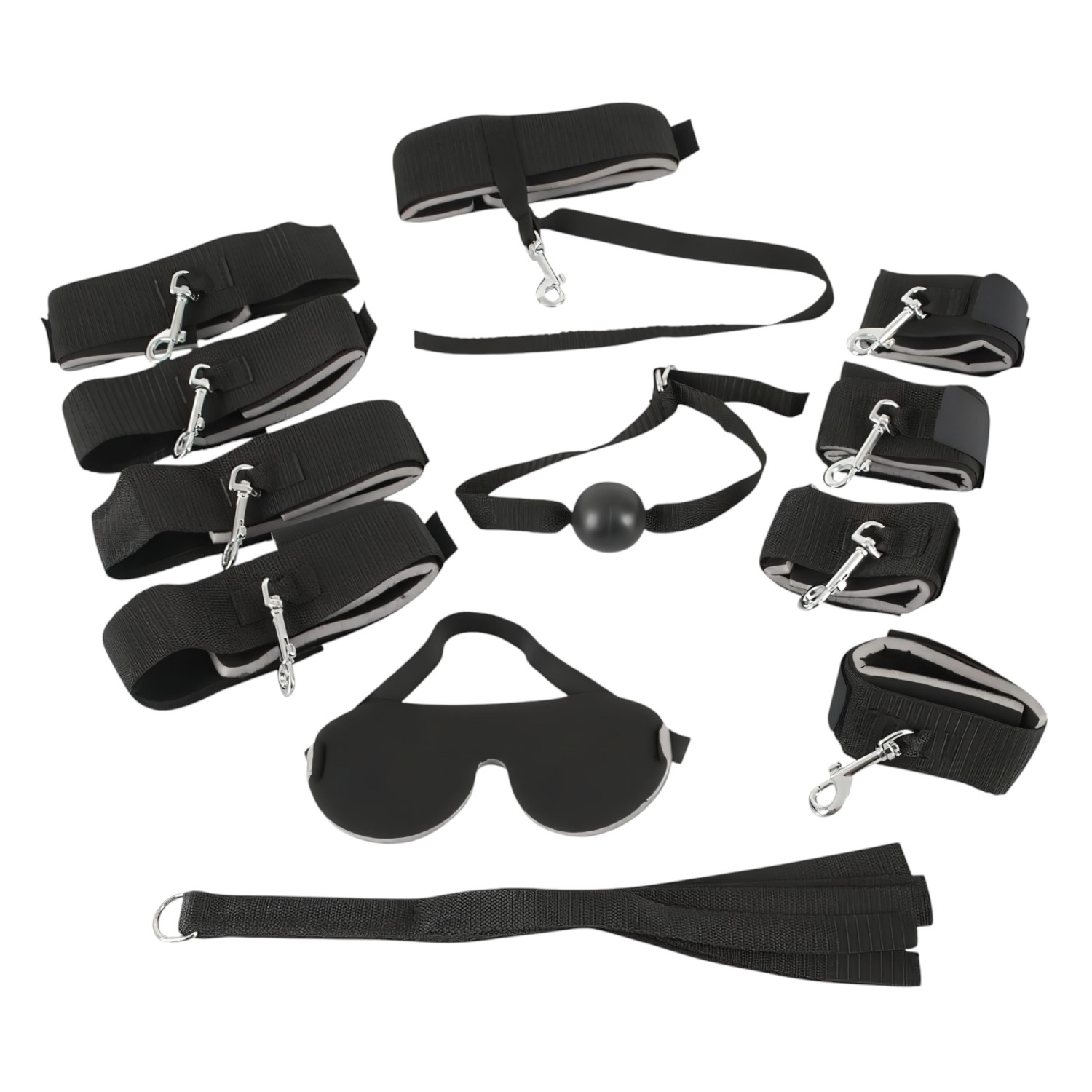 Hajtogasd ki a párnázott fekvőfelületet és helyezd el az ágyra, a földre vagy bármilyen stabil felületre. A 9 darab fém D-gyűrű lehetőséget ad arra, hogy a kar- és lábpántokat, nyakörvet, pórázt a kívánt pozícióban rögzítsd. A mellékelt korbáccsal még tovább fokozhatod a játék hevét. A szett minden elemét a fantáziátok szerint variálhatjátok – csak a képzelet szab határt!