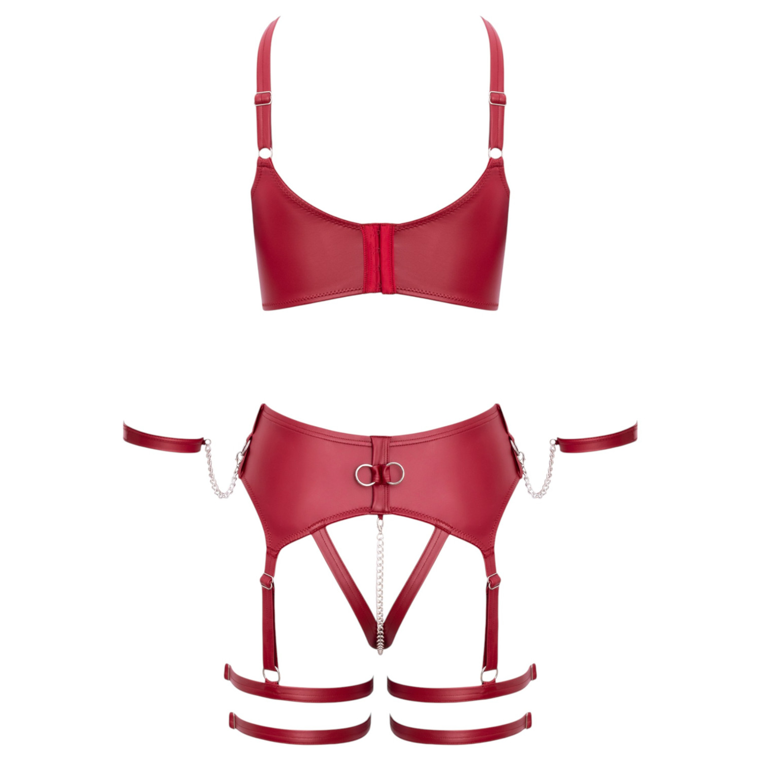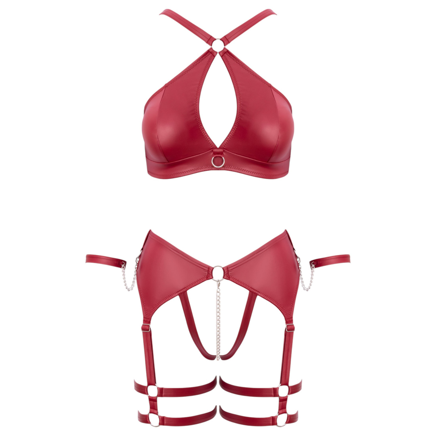 A Cottelli Bondage keresztpántos melltartó szett a szenvedély és a provokáció tökéletes harmóniáját nyújtja. A szett tartalmaz egy pánt nélküli melltartót, egy nyitott alsót harisnyatartó stílusban és egy pár puha bilincset. Az élénk, sötétpiros matt hatás kifinomult és érzéki megjelenést biztosít. A melltartó kényelmes és állítható, a kivágott tanga stimuláló lánccal pedig izgalmas játékot tesz lehetővé. A szett különlegességét a dekoratív gyűrűk és a csatlakoztatható bilincsek adják, amelyek még forróbb hangulatot teremtenek.